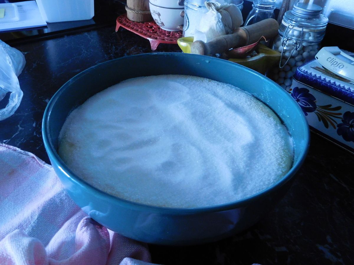 Lundi : Mettre le levain dans un saladier et ajouter 250 g de sucre. Ne pas mélanger et couvrir d’un torchon, laisser à température ambiante.