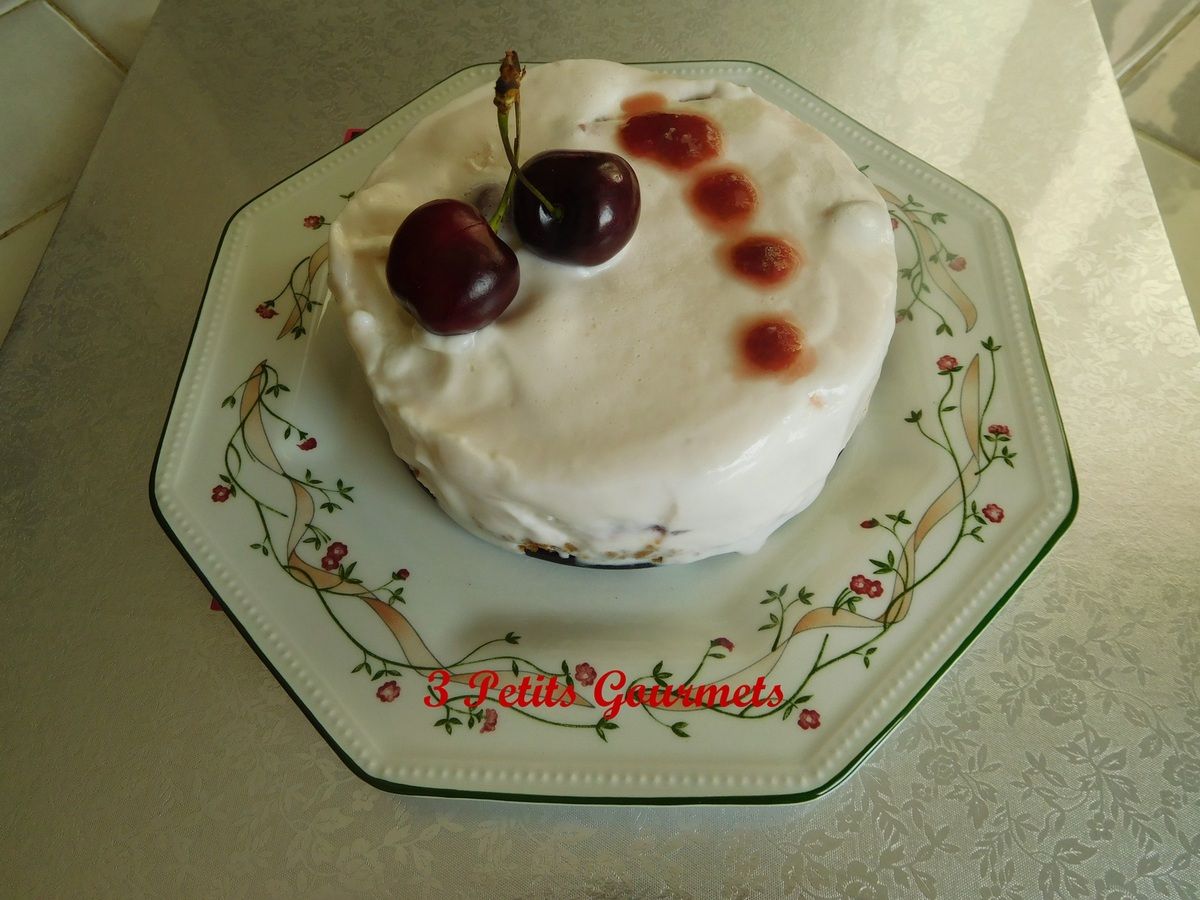 Juste avant de servir, poser chaque cercle sur une assiette à dessert, retirer le papier sulfurisé, les cercles et le rhodoïd. Décorer avec les cerises entières et un peu de coulis de cerises.