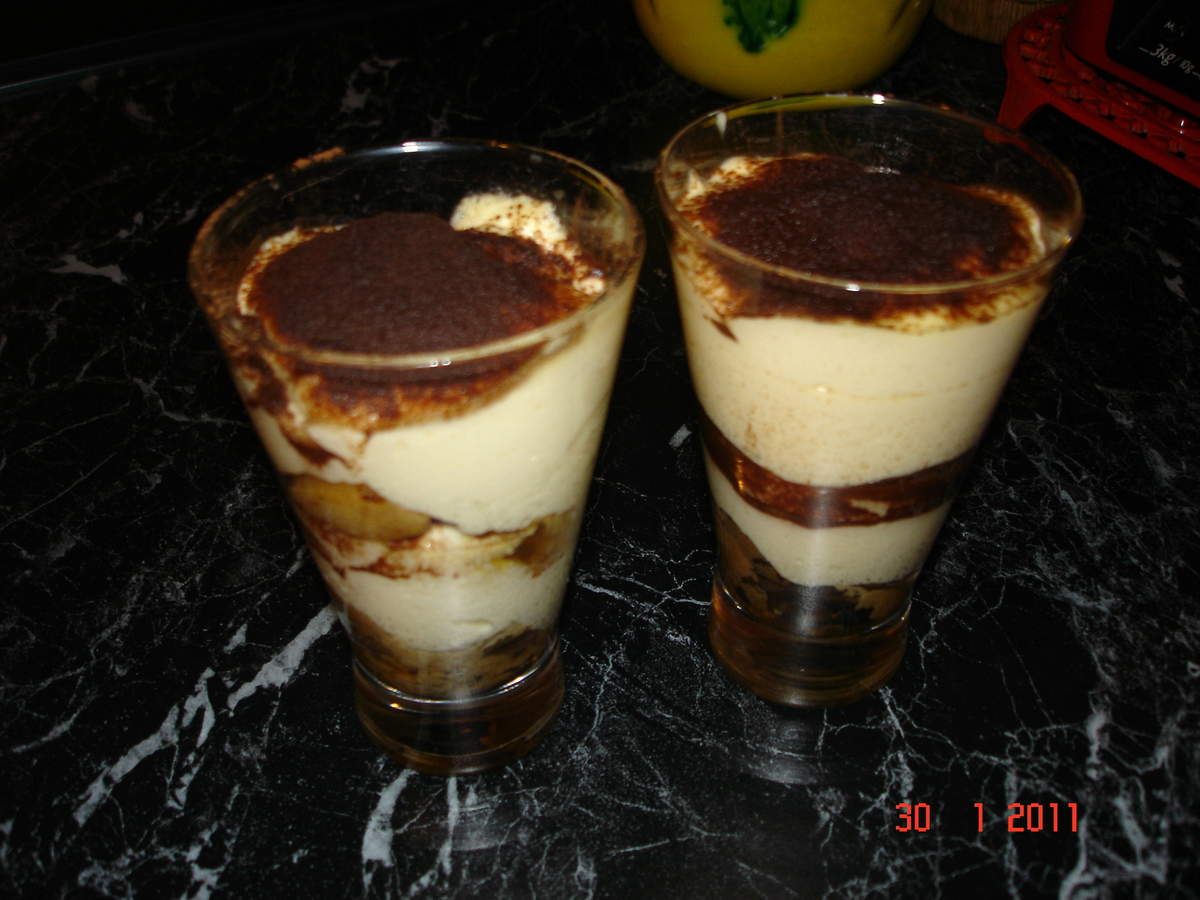 Recouvrir de crème au mascarpone jusqu'à mi-hauteur puis déposer un autre biscuit imbibé de café. Remplir la verrine de crème et saupoudrer de cacao à travers une petite passoire.